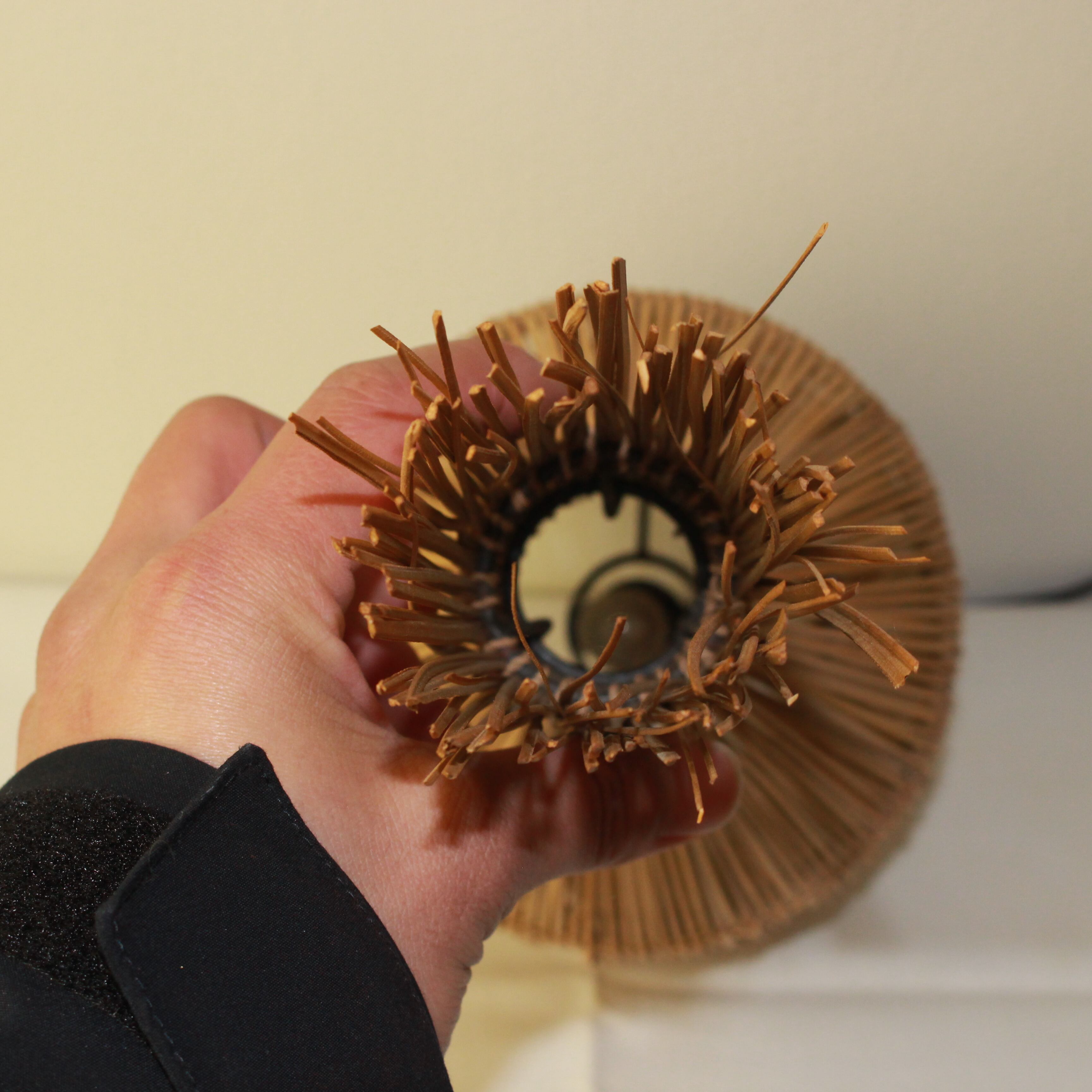 細く割いた籐を編み上げたシェードから、やわらかな光がこぼれ落ち、